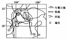 读我国某地区年雾日天数等值线图(图中②③④均为省级中心城市)。回答下面三题。
