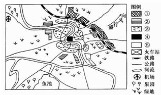 图为“某城市功能分区示意图”,图例中序号代表不同类型的工能区。读图回答下面两题。