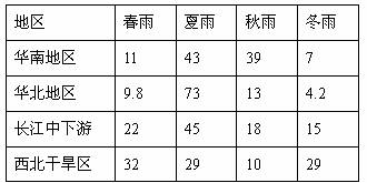 材料三 中国各地降水季节分配(占年总量的百分比)