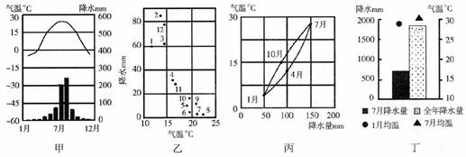 C.年降水量最大的是丙 D.高温期与多雨期不一致的是丁