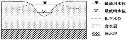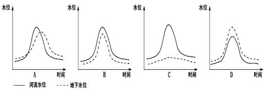 17.下列四幅图中能正确反映河水位与地下水位关系的是 ( )