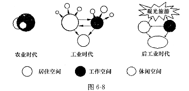 人们日常的活动空间,大体可分为居住、工作、休闲三类,每一类活动的空间规模与当地社会经济的发展息息相关。图6-8表示从农业时代、工业时代向后工业时代演化过程中,居住空间、工作空间、休闲空间的变化情况,读图6-8完成29-30题。