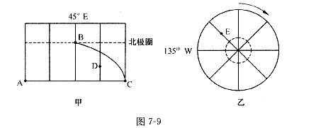 31.(18分)在图7-9中,AC为赤道,BC为晨昏线的一部分,B点的地方时比A点的早,此时D点的地方时为15时,据此读图完成下列要求。