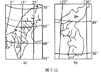 (1)两图中比例尺较大的是 ,a图A地位于b图B地的 方向。(2分)
