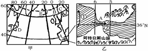 (4)乙图中①、②两个箭头表示的表层海水流向是否正确,并写出它们的正确流动方向,从成因上看两者之间有何不同?