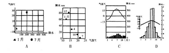 (1)宁夏平原与法国的葡萄种植区相比,在气候方面,前者为__________气候,法国以______气候为主(以上两空请从下图A-D中选择,填字母)。葡萄种植区主要在法国的 部。2006年3月,河流在P地突然决堤泛滥,其原因是发生了___________。