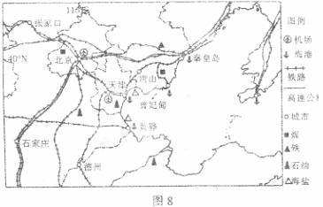(3)根据图8和材料一,简要说明环渤海地区交通发达、便捷的具体表现。(6分)