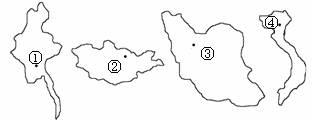 读图中四个亚洲国家,回答1-2题。