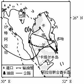 读卡塔尔位置图,回答3-6题。