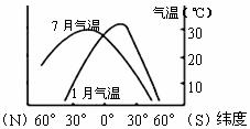 左图是中纬度某月海洋与陆地表面等温线分布图,右图是某条经线上不同纬度1月和7月气温分布示意图。读图回答13-14题。