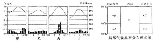 (1)甲、乙、丙、丁四种气候类型中,与“局部气候类型分布模式图”中C地相对应的是 ;其气候特点是 ,对应的自然带名称为 。A、B、D三地气候成因与C相同的是 地(填字母)。(8分)