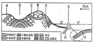 (1)从地质构造上看属于向斜的是 ,图中有 个断层,B处的地形是 ,其形成的原因是 。(8分)