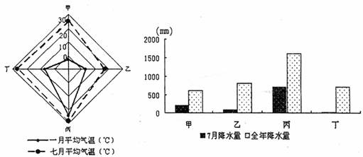 下图为甲、乙、丙、丁四个地区的气温雷达图和降水柱状图,读图回答29、30题。