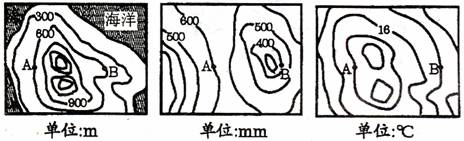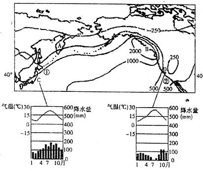 (1)比较A、B两地降水量的差异并分析原因。(4分)