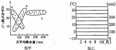 32.下图甲是根据a、b、c三地各月平均气温和平均降水量所作的统计图(每个区间有12个点,表示12个月),据此完成下列要求。(6分)