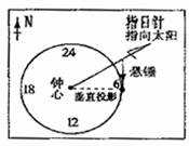 北半球某城市的广场中心地面平置一口白日工作钟(下图),指日针白天指向太阳,其悬锤指向钟面时刻。据此完成10-11题。