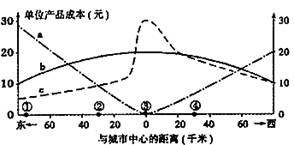 读某工业部门在某城市及其附近地区土地、运输和劳动力等成本曲线图,其中土地成本和运费都只与距城市中心的远近、交通通达度有关。回答25-26题。