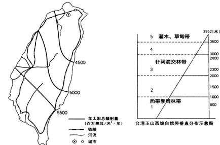 61.(9分)读台湾年太阳总辐射量分布图和玉山西坡垂直自然带分布示意图,回答问题。