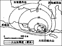 读1867年印度尼西亚大松巴哇火山爆发后火山灰厚度的分布图,判断17~18题。