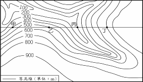20.图中甲、乙、丙、丁四地中,最适宜形成聚落的是