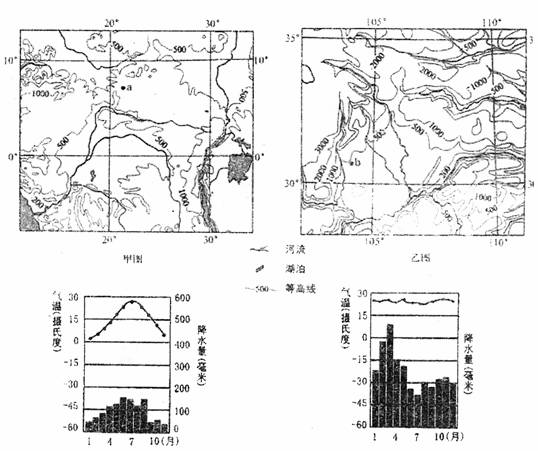 (三)读“两地区等高线分布示意图”以及流经两地区主要河流流域的“气温曲线和降水柱状图”,回答有关问题:(20分)