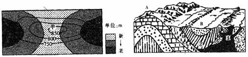 (四)读某地区等高线及地下岩层新老关系图(左图所示),地质构造图(右图所示)