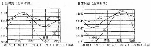 南沙群岛海马滩(10°43′N,117°40′E)则是我国大陆每一个新年迎接第一缕阳光的地方。而浙江温岭石塘镇(28°16′N,121°36′E)则是我国大陆每一个新年迎接第一缕阳光的地方。下图是2008年10月1日到2009年10月1日三地日出日落时刻变化曲线。回答7-8题。
