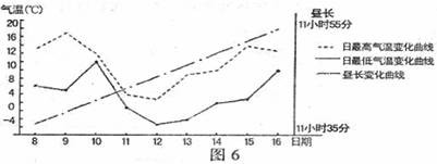 图6是济南市某时段气温和昼长变化示意图。读图6回答15-17题。