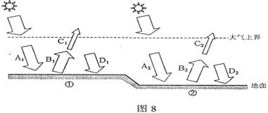 图8中,①②两地纬度相同,海陆位置相近,各箭头表示不同的辐射形式。读图8回答18-21题。