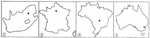 下图是四个国家的轮廓及首都示意图。回答1-2题。