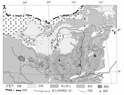 (1)描述图示地区地表沉积物质组成的分布特点,指出黄土高原与黄土地貌形成的主要外力作用。(6分)