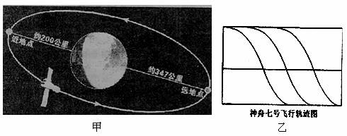 2008年9月27日北京时间16时44分,太阳非常平静,航天员翟志刚走出“神舟七号”舱门,实现了中国历史上的首次太空行走。下图甲是“神舟七号绕地球运行轨道示意图”,飞船绕地球运行周期是90分钟,图乙为神舟七号轨道在地球表面上的投影,读图回答第1题。