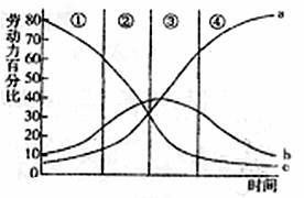 6.上图中a、b、c三条曲线,表示工业和服务业的劳动力比例变化曲线分别是 ( )