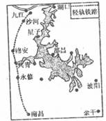 2007年11月,昌九城际轻轨路已全线动工,预计2010年6月建成通车。下图为鄱阳湖及其周边市、县分布略图,据此回答1-3题。