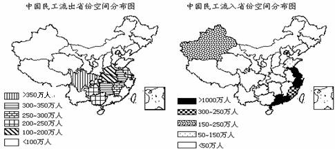 据国家农调总队的抽样调查,我国每3个产业工人中就有2个来自农村,2003年我国外出务工的农民达1.14亿。读下图完成8-9题。