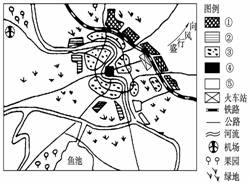 下图为“某城市功能分区示意图”,图例中序号代表不同类型的功能区,读图回答11-12题。