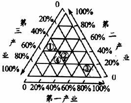 下图表示①②③④四个地区三个产业的就业构成,读图回答28-29题。
