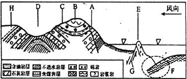 (1)从地质构造上看属于向斜的是___________,图中有___________个断层,B处的地形是___________,其形成的原因是_________________________________。