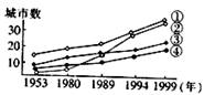 下列四条曲线分别代表珠江三角洲、长江三角洲、京津唐和辽中南四地区城市数量的变化过程。读图,回答6-9题。