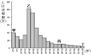 2.图中甲-丁不同年龄段的人口迁移,有明显相关的是 ( )