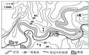 4.该地区拟建一条铁路,有人设计了一选线方案(如图)。方案沿线甲、乙、丙、丁四处中明显不合理的有 ( )
