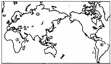 下图为“世界海陆轮廓图”,读图完成6-7题。