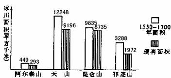读下图“我国西北部分山脉1550年-1700年冰川与现有冰川面积的变化情况”,回答8-9题。