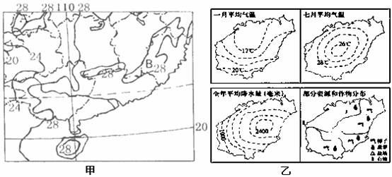 34.下图中甲图是我国东南部地区7月平均气温分布图,乙图为海南岛相关资料,读图回答下列问题。(30分)