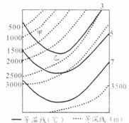 下图是某海域等深线和表层年平均等温线分布图,读图回答3-4题。
