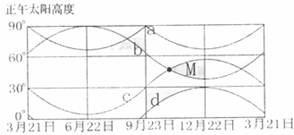 下图中a、b、c、d表示地球上四个不同纬度地区正午太阳高度的年变化曲线,图中M为b、c两线的交点,读图回答9-11题。