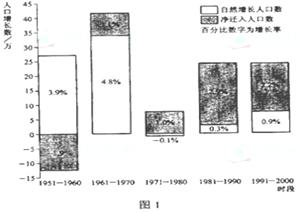 图1显示某国1951--2000年每10年的人口变化。读图1完成4-5题。