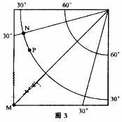 图3是经纬网图,已知M地位于赤道,N地比P地先见到日落;此刻,图中70度纬线以内为极昼,再过8小时,N地太阳高度达当日最大。读图回答10-11题。