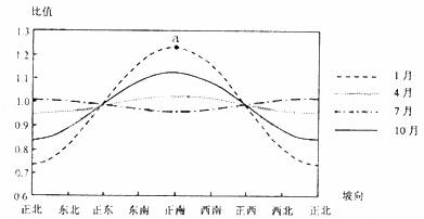 下图表示“27°N某地坡向(坡度为10°)对地表获得太阳辐射的影响”,纵坐标表示该地坡面与地平面获得太阳辐射量的比值(仅考虑地球运动和地形因素)。完成27-28题。