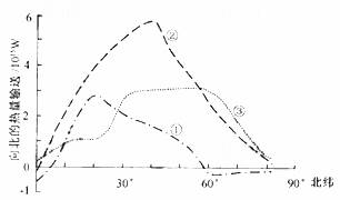 大气环流和大洋环流源源不断地从低纬度向高纬度输送热量,下图表示“北半球向北的热量输送随纬度的变化”。完成31-32题。